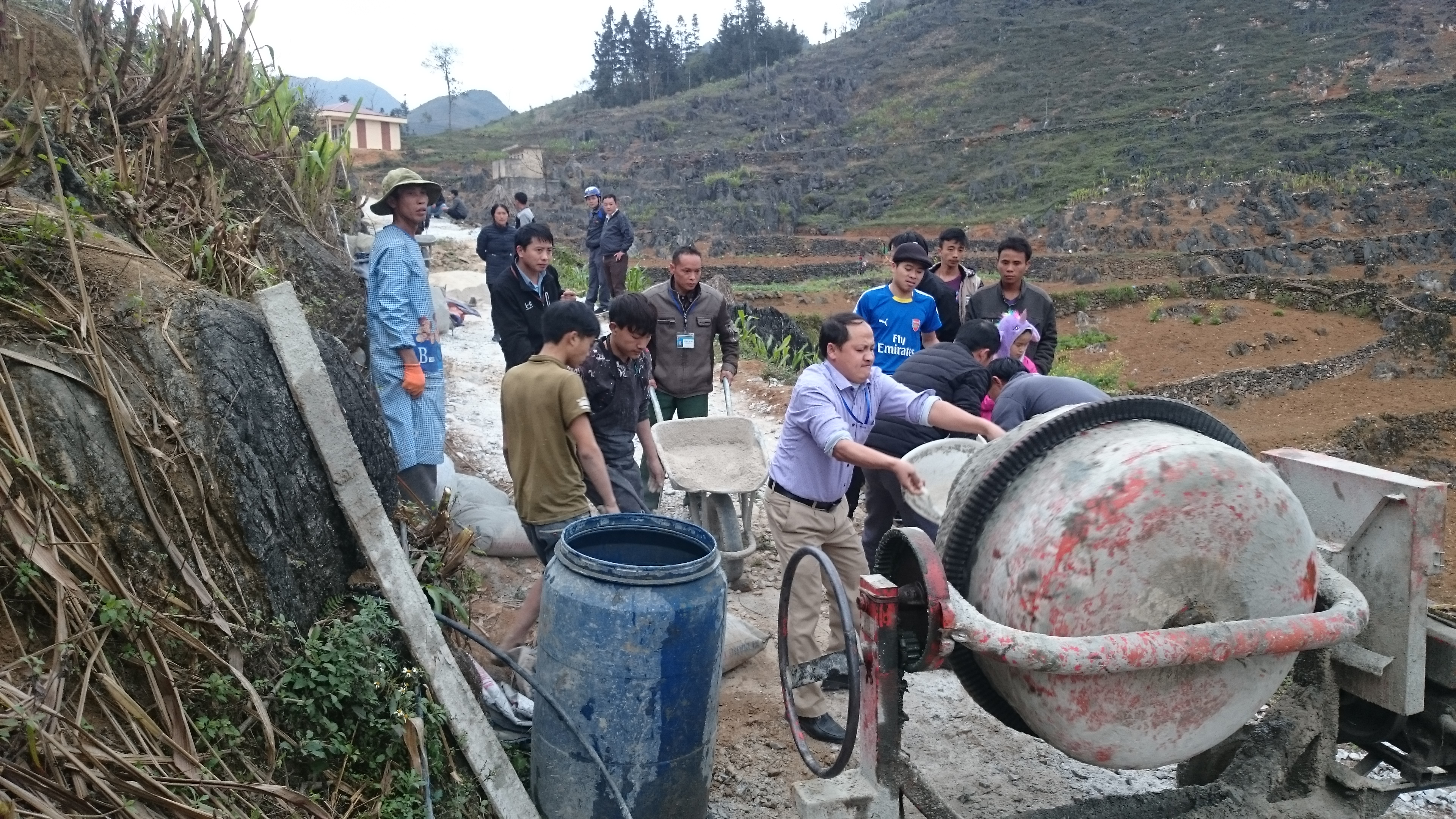 các đại biểu đang giúp người dân trộn bê tông đổ đường