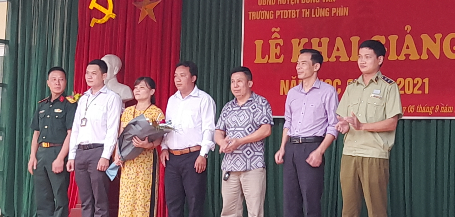 Các đồng chí lãnh đạo huyện và xã chụp ảnh lưu niệm với trường tiểu học xã Lũng phìn