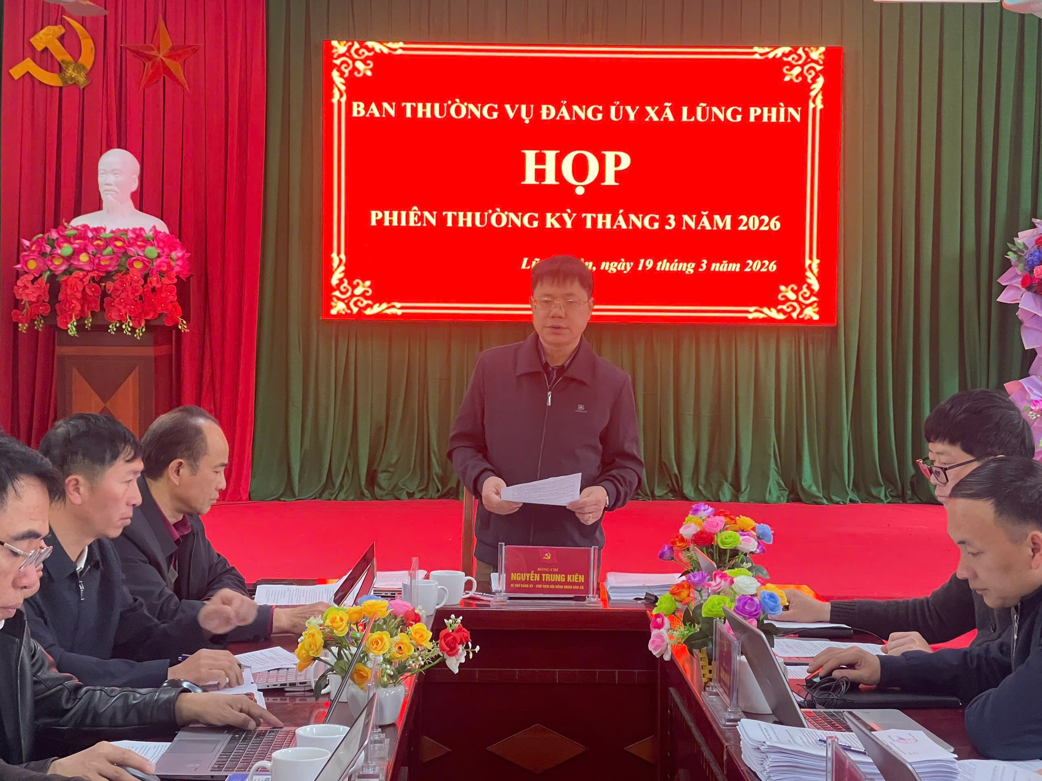 Đồng chí Nguyễn Trung Kiên – Bí thư Đảng ủy – Chủ tịch HĐND xã chủ trì Phiên họp; Dự phiên họp còn có đồng chí Nguyễn Thanh Viễn – Phó bí thư Thường trực Đảng ủy; đ/c Nguyễn Văn Chinh – Phó bí thư, Chủ tịch UBND xã; các đồng chí Ủy viên Ban thường vụ Đảng ủy xã.