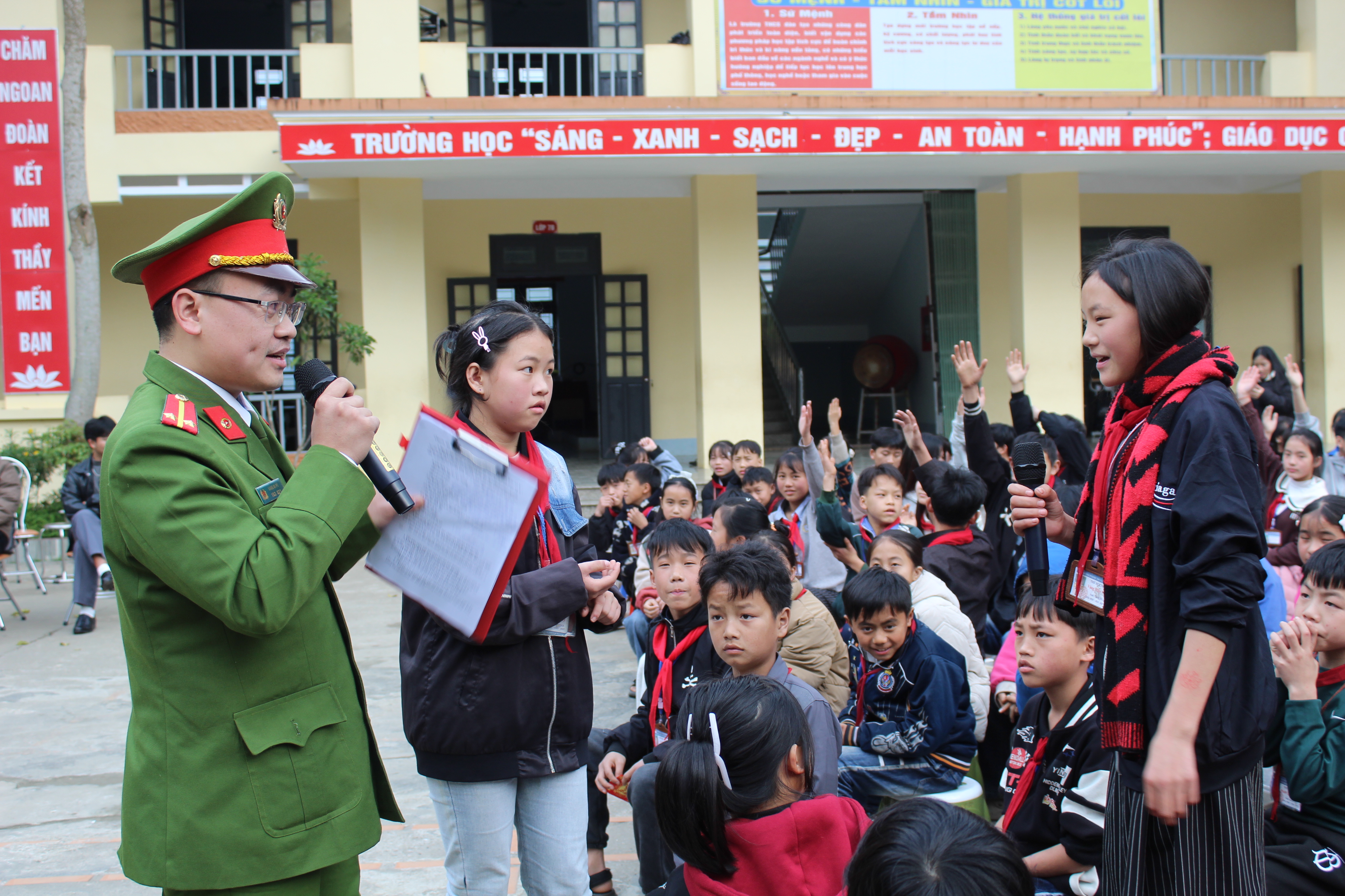 Chương trình cũng dành thời lượng để tuyên truyền, giáo dục pháp luật cho học sinh với các nội dung như: Lừa đảo qua không gian mạng, phòng cháy chữa cháy, phòng chống bạo lực học đường và an toàn giao thông, góp phần nâng cao ý thức chấp hành pháp luật, hình thành lối sống lành mạnh, trách nhiệm, phù hợp với chuẩn mực đạo đức và quy định của xã hội. Hình thức truyền thông sinh động, kết hợp trao đổi, hỏi – đáp, hái hoa dân chủ đã thu hút sự quan tâm, tham gia tích cực của các em học sinh.