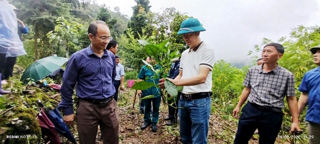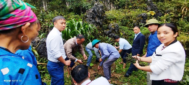 Đ/c: Nguyên Thanh Viễn - Phó Bí thư Thường trực Đảng uỷ xã cùng với lãnh đạo các ban, ngành trồng cây chàm nhuộm vải