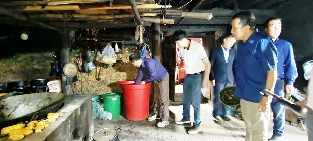 Các đồng chí lãnh đạo kiểm tra cách ngân ủ lá chàm tại Hộ gia đình Nhà: Vàng Páo Sảnh - Thôn Tráng Chá Phìn.